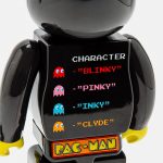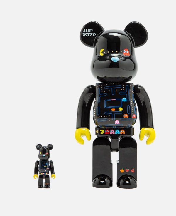 Con una base nera lucida, la figura è impreziosita da una grafica di motivi PAC-MAN vintage, raffiguranti lo schermo di gioco retrò. A partire dalla parte superiore della figura c’è una stampa del tabellone, insieme al conteggio dei punti vita, completata da una breve sequenza di Pac-Man che si avvicina a un fantasma rosso. Il corpo del bearbick è decorato con il labirinto del gioco, che mostra quattro fantasmi a caccia di Pac-Man appena prima che mangi un’arancia. Altre caratteristiche come le mani gialle della figura, le opere d’arte lungo la vita e i piccoli frutti decorati in basso a sinistra completano il design di ispirazione retrò di Bearbrick.
