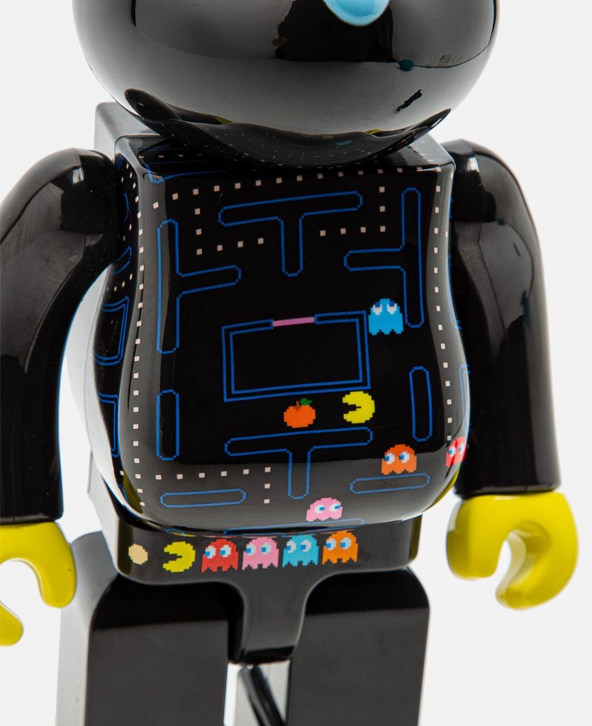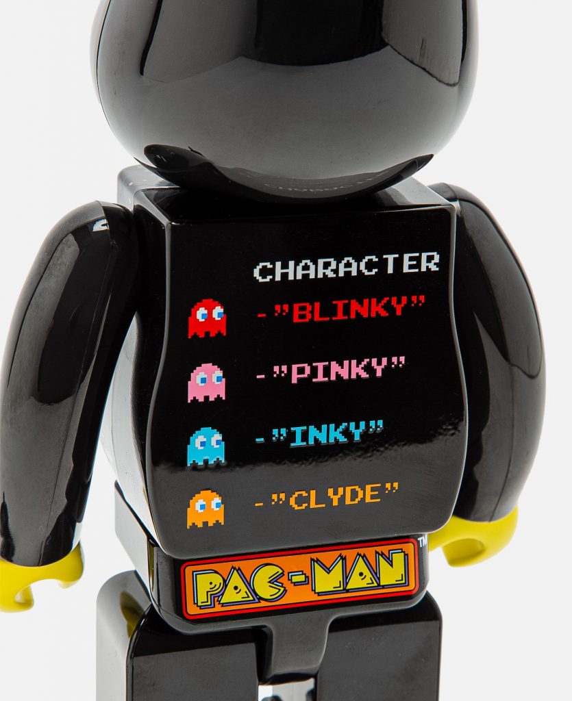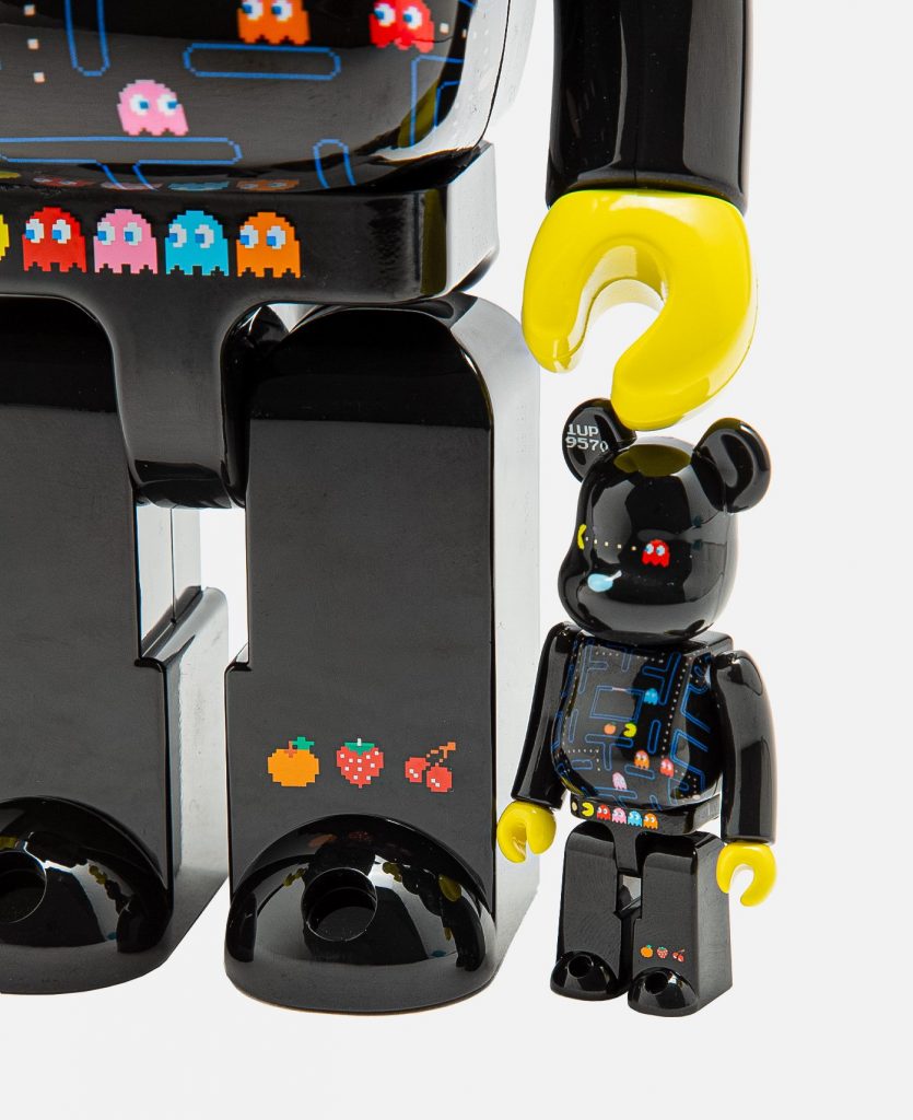 Con una base nera lucida, la figura è impreziosita da una grafica di motivi PAC-MAN vintage, raffiguranti lo schermo di gioco retrò. A partire dalla parte superiore della figura c’è una stampa del tabellone, insieme al conteggio dei punti vita, completata da una breve sequenza di Pac-Man che si avvicina a un fantasma rosso. Il corpo del bearbick è decorato con il labirinto del gioco, che mostra quattro fantasmi a caccia di Pac-Man appena prima che mangi un’arancia. Altre caratteristiche come le mani gialle della figura, le opere d’arte lungo la vita e i piccoli frutti decorati in basso a sinistra completano il design di ispirazione retrò di Bearbrick.