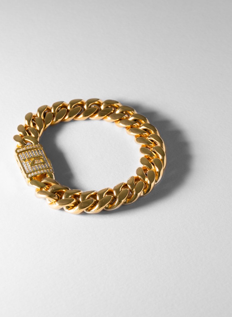 Bracciale a catena rivestito in oro giallo/bianco 18 carati con micropavé di pietre incastonate a mano di colore bianco. Chiusura a cassetto con finitura da alta gioielleria con logo.