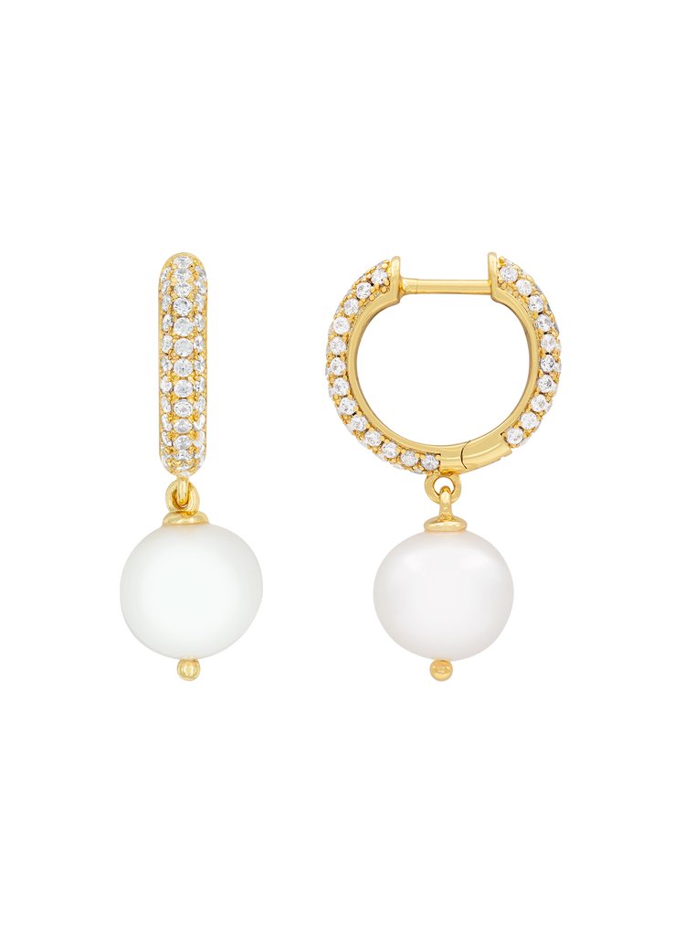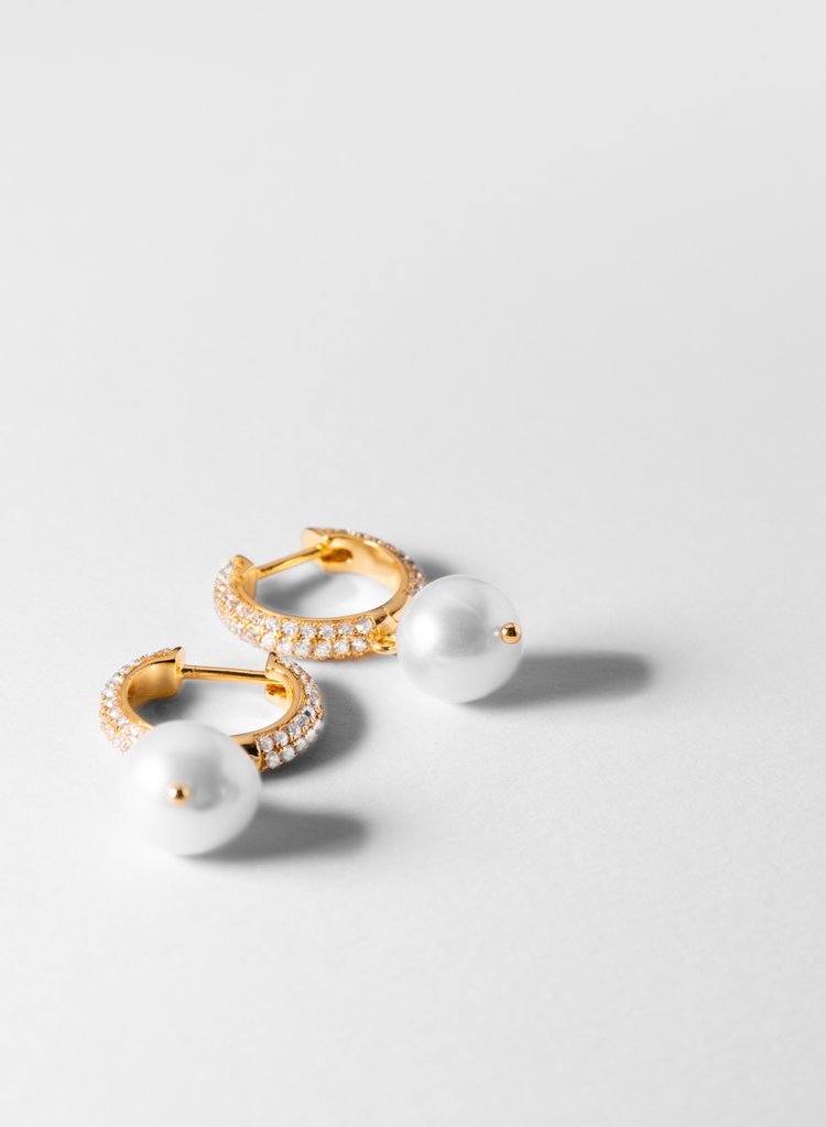 Orecchini di perle in oro 18 ct/rodio con pietre micropavé incastonate a mano di colore bianco e perle naturali d’acqua dolce indonesiane di colore bianco/grigio marabè. Logo laserato all’interno.