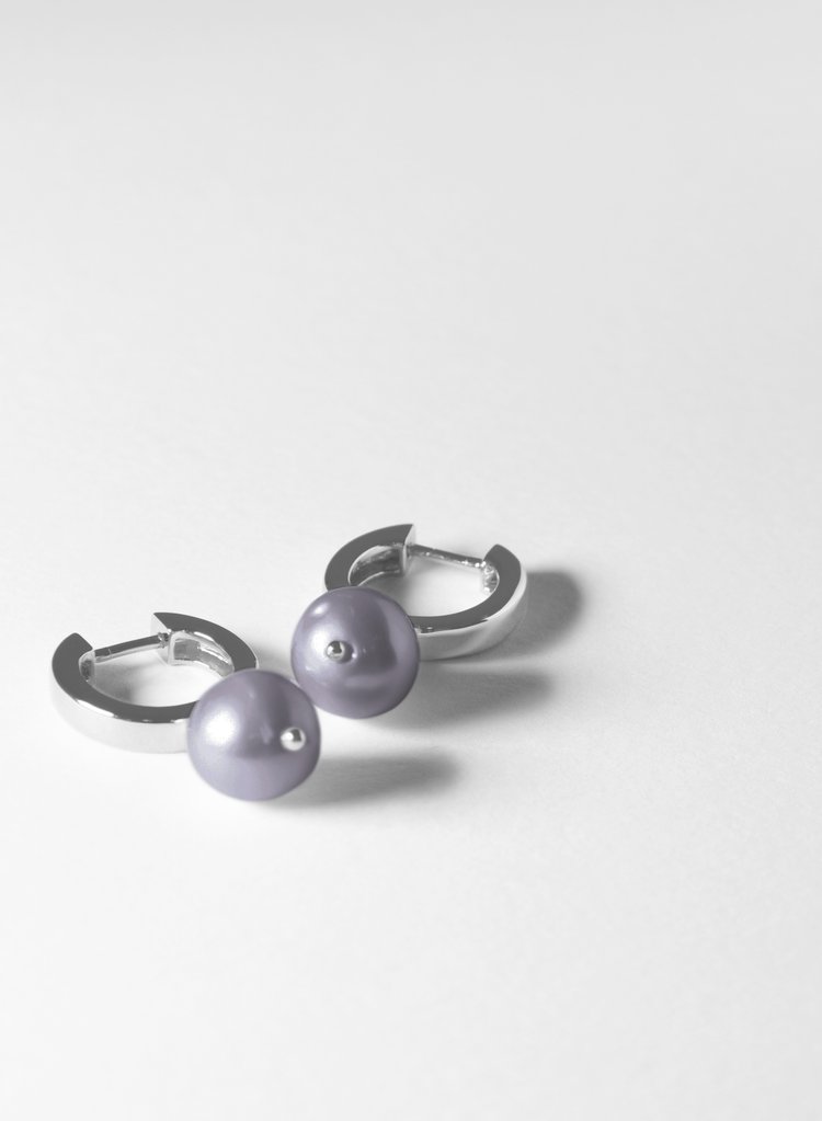 Orecchini di perle rivestiti in oro rodiato/18k con perle naturali d’acqua dolce indonesiane di colore grigio/bianco mabe. Logo laserato all’interno.