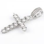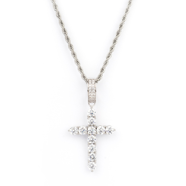 Pendente Croce in Acciaio Inox rivestito in Oro Bianco 18 carati, Fissaggio Elettromagnetico e Zirconi Taglio Diamante Qualità 5A+ Incassati a Mano. Logo Inciso.