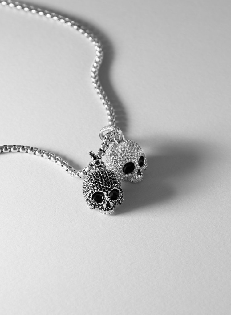 Collana con teschi rodiati con pietre micropavè incastonate a mano in bianco e nero e smalto nero dipinto a mano. Chiusura a moschettone con targhetta logo in metallo.