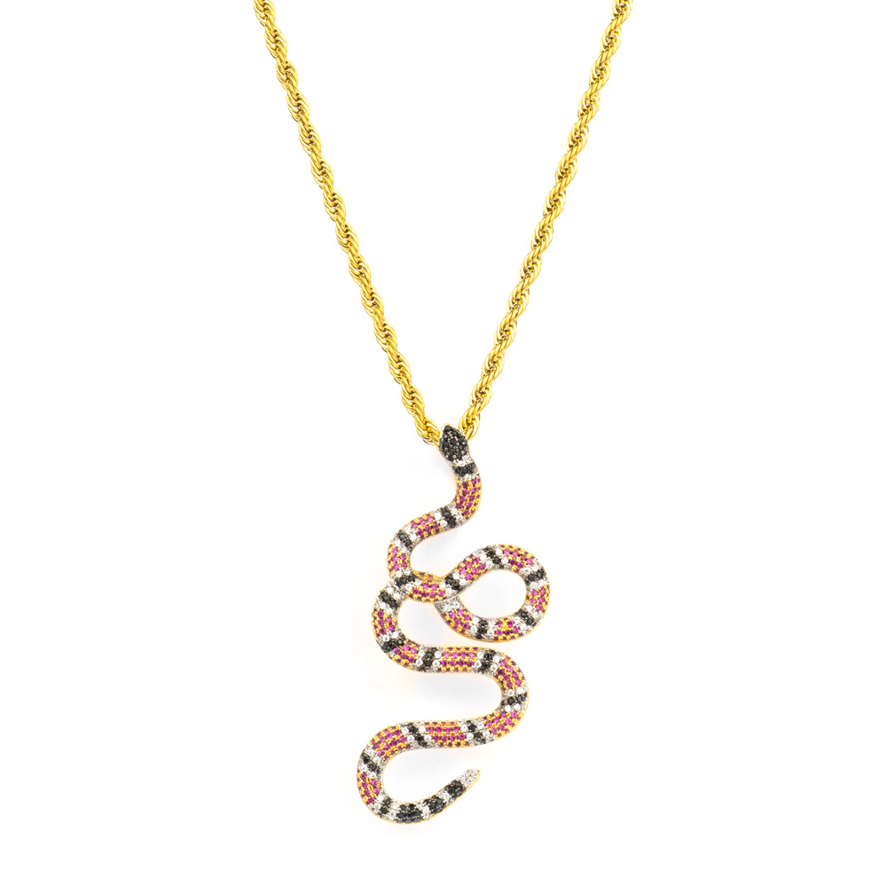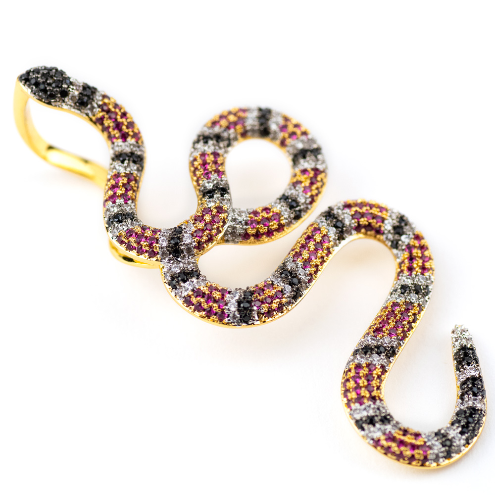 Pendente Snake in Acciaio Inox rivestito in Oro Bianco, Giallo e PVD Nero 18 carati, Fissaggio Elettromagnetico, Zirconi Bianchi e Neri Taglio Diamante Qualità 5A+ e Rubini Idrotermali Incassati a Mano. Logo Inciso.