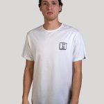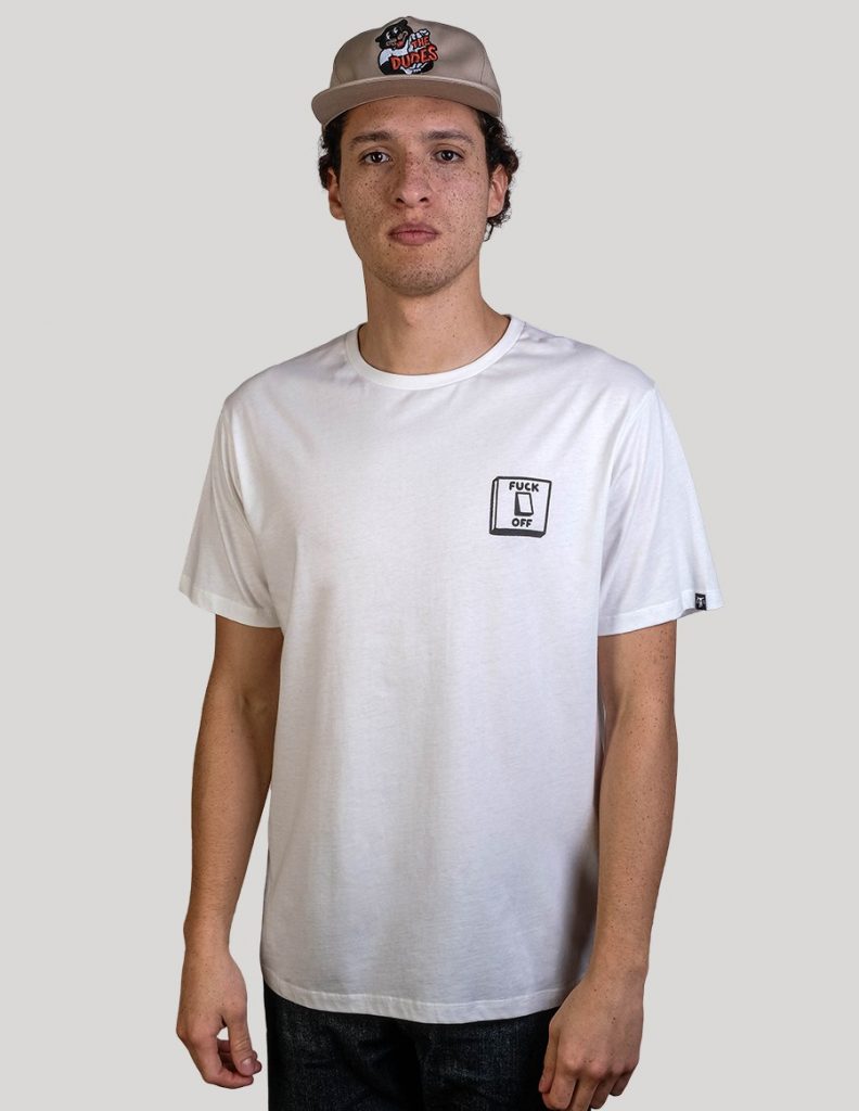 T-shirt girocollo a manica corta “SWITCH” di Dudes Factory. T-Shirt con stampa anteriore e stampa sulla schiena. 100% cotone.