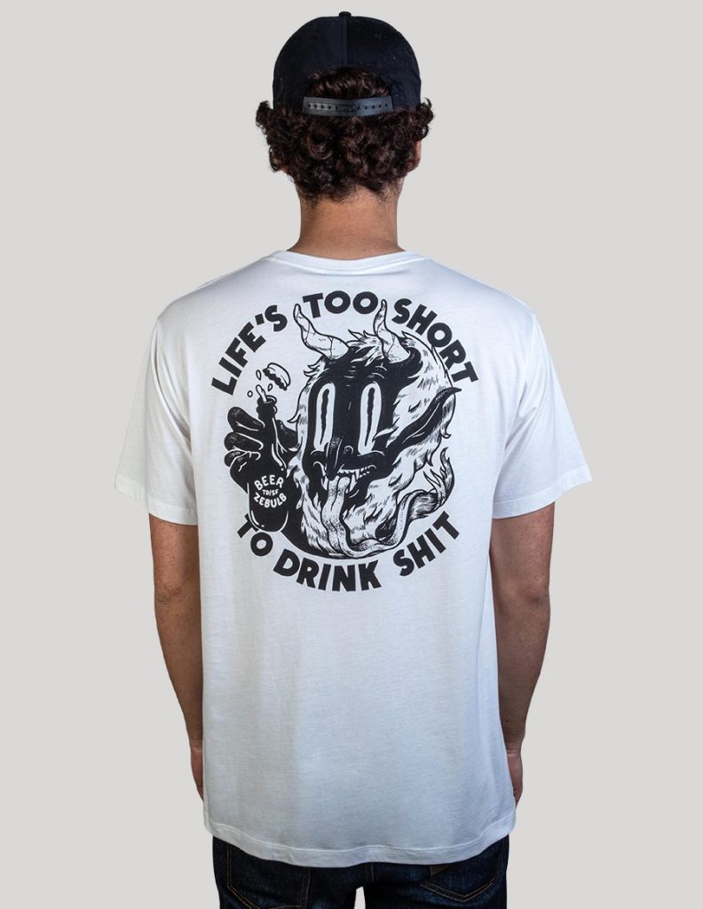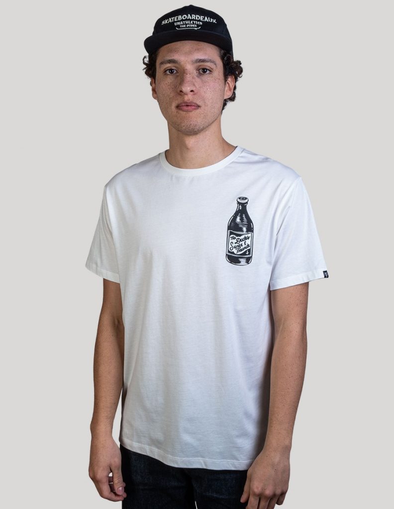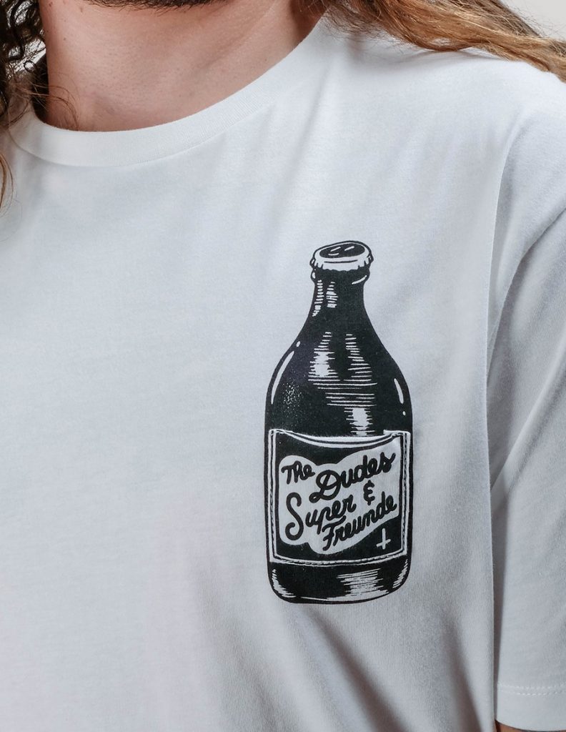T-shirt girocollo a manica corta “TOO SHORT DRINKS” di Dudes Factory. T-Shirt con taschino, stampa anteriore e stampa sulla schiena. 100% cotone.