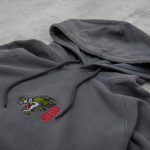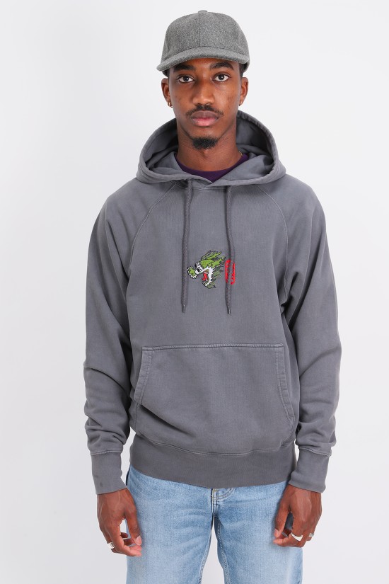 Felpa con cappuccio “Dragon Hoodie” di Edwin. Il drago è una delle creature soprannaturali tra le più conosciute nel folkore giapponese. Nella mitologia nipponica, il drago è associato all’acqua, una divinità quindi della pioggia e delle correnti. Edwin omaggia la potenza e la maestosità di questa creatura leggendaria, proponendola con un ricamo frontale su questa hoodie dalla vestibilità abbondante. Il tessuto della felpa è stato lavorato con un particolare lavaggio che gli dona un colore ‘slavato’ dall’effetto vissuto, mentre la comoda tasca a canguro permette di riporre al suo interno gli oggetti personali.