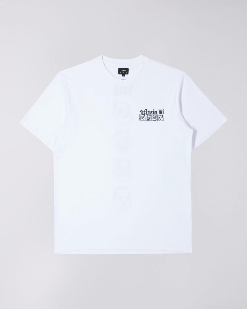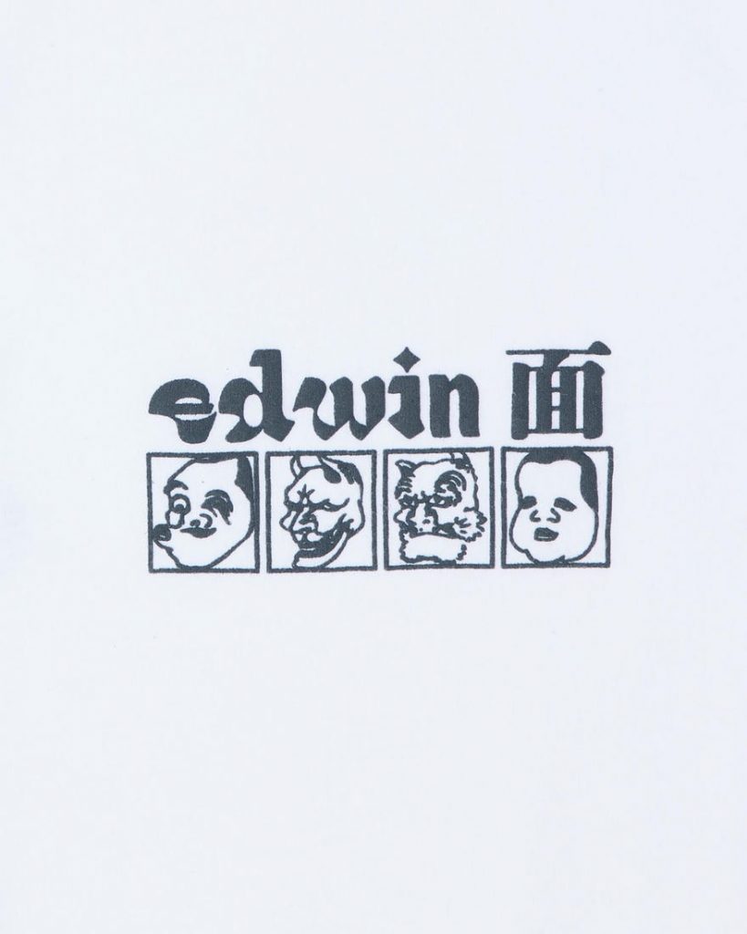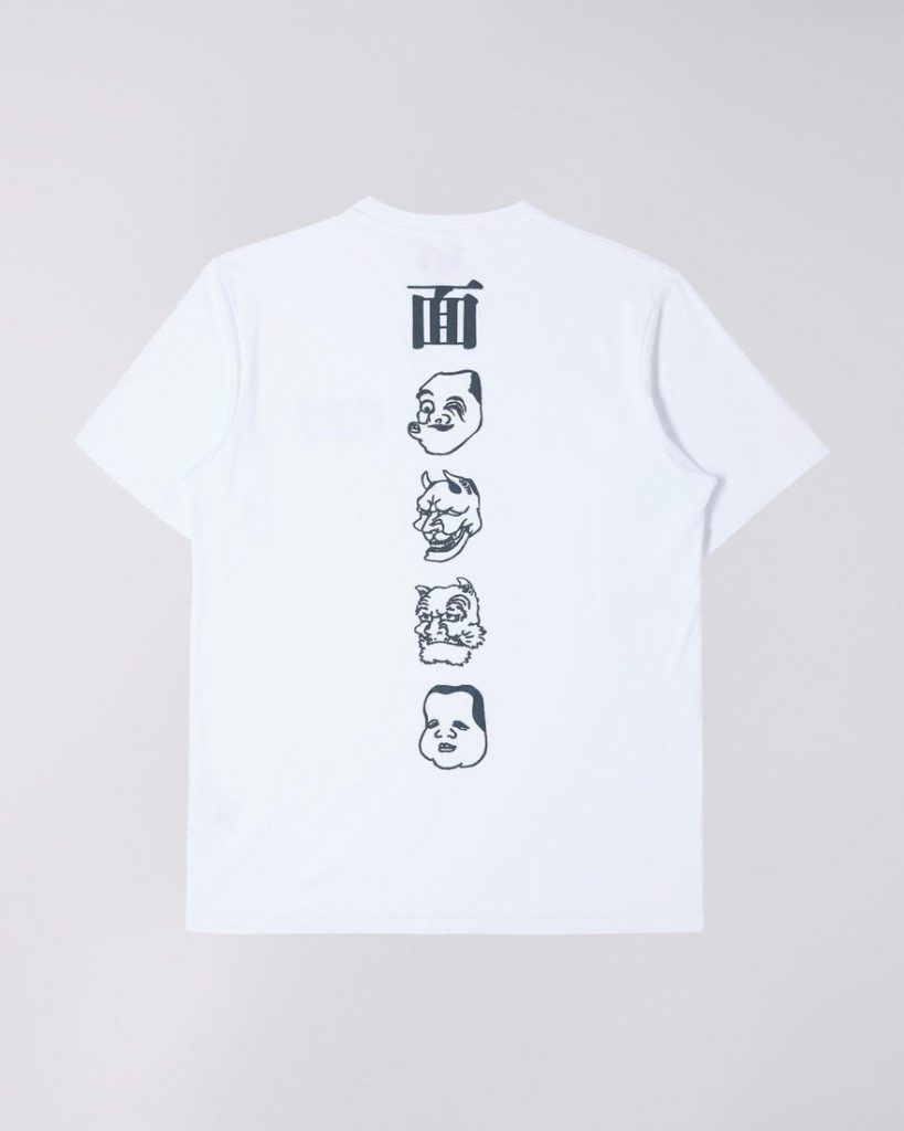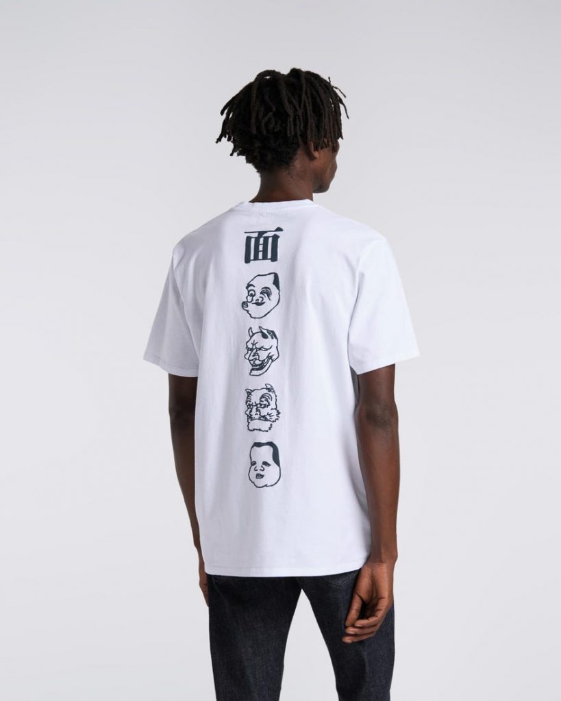 Katsushika Hokusai è famoso principalmente per le sue vedute del Monte Fuji, ma oltre alle opere a tema naturalistico, l’artista era dedito a ispirarsi al folklore giapponese dell’epoca. Questa T-shirt di Edwin è dedicata al maestro dell’arte Ukyo-e. Le stampe gommate sul petto e sulla schiena, raffigurano le maschere del teatro Kabuki ideate dall’artista del “mondo fluttuante”.