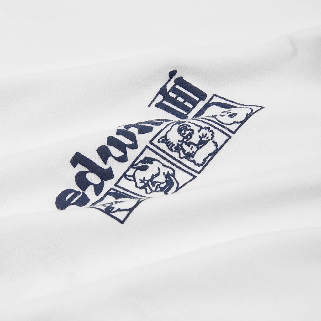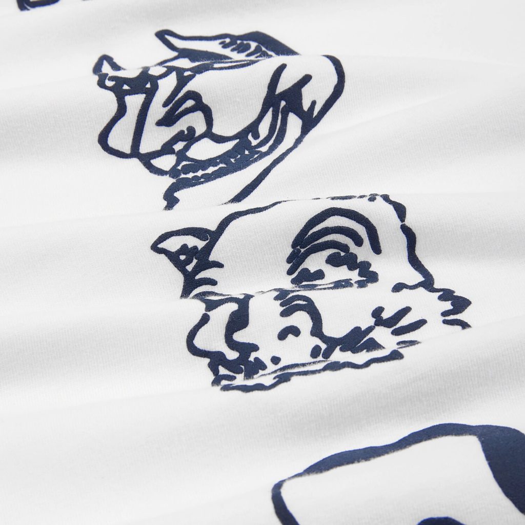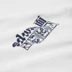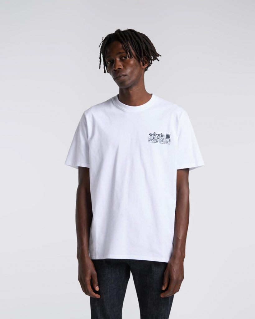 Katsushika Hokusai è famoso principalmente per le sue vedute del Monte Fuji, ma oltre alle opere a tema naturalistico, l’artista era dedito a ispirarsi al folklore giapponese dell’epoca. Questa T-shirt di Edwin è dedicata al maestro dell’arte Ukyo-e. Le stampe gommate sul petto e sulla schiena, raffigurano le maschere del teatro Kabuki ideate dall’artista del “mondo fluttuante”.