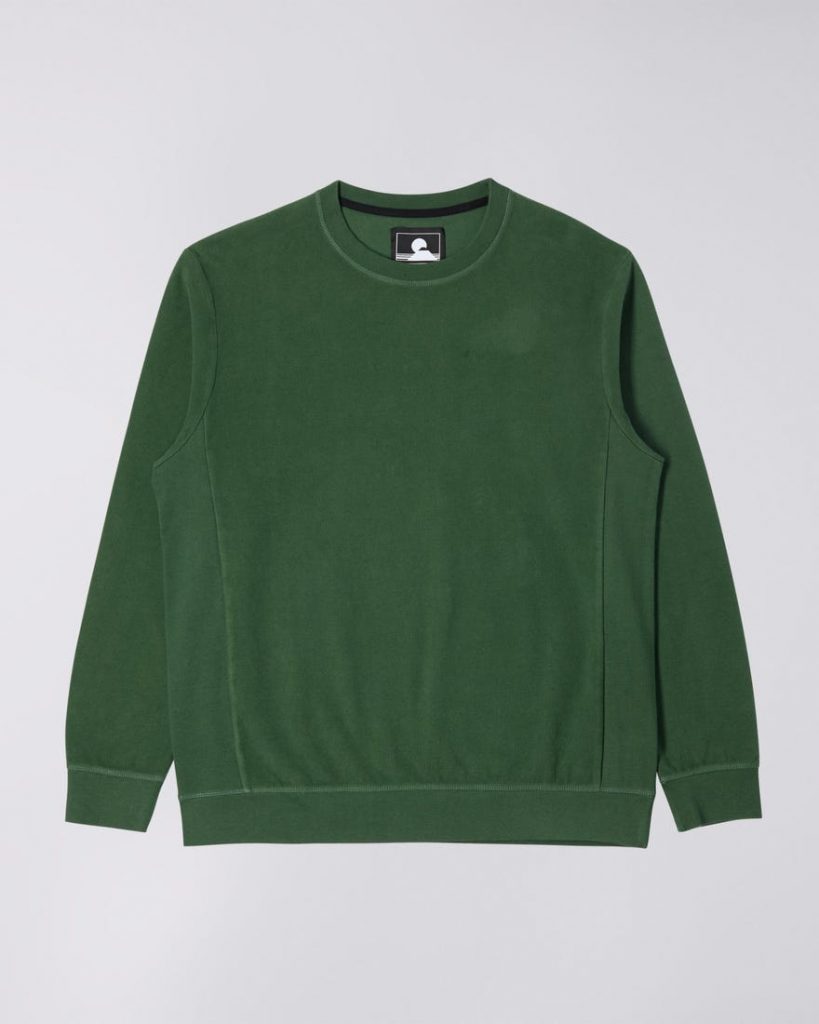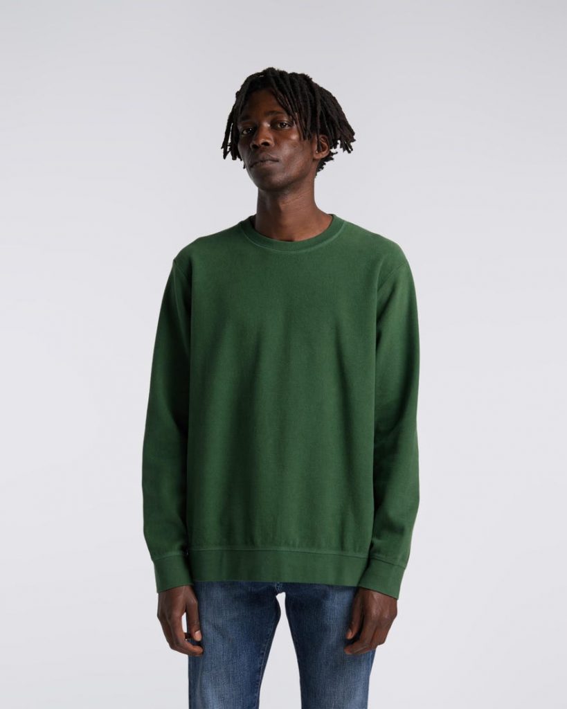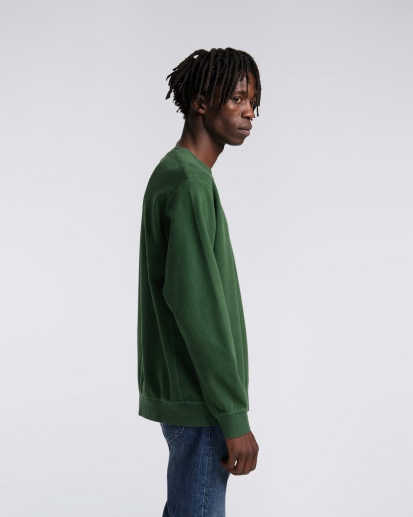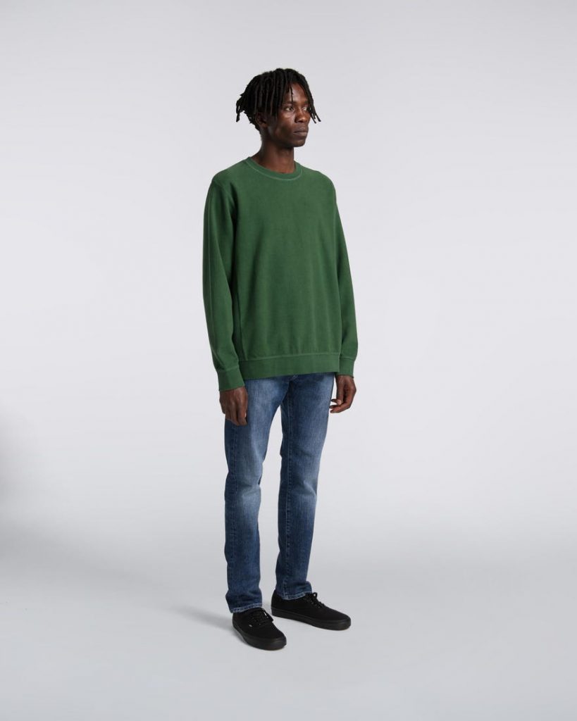 Felpa girocollo di Edwin realizzata in velluto di cotone Nicky: morbido, elasticizzato ed elegante. Il capo presenta un look basic, vestibilità abbondante con giromanica ampio.