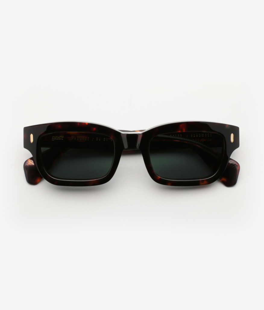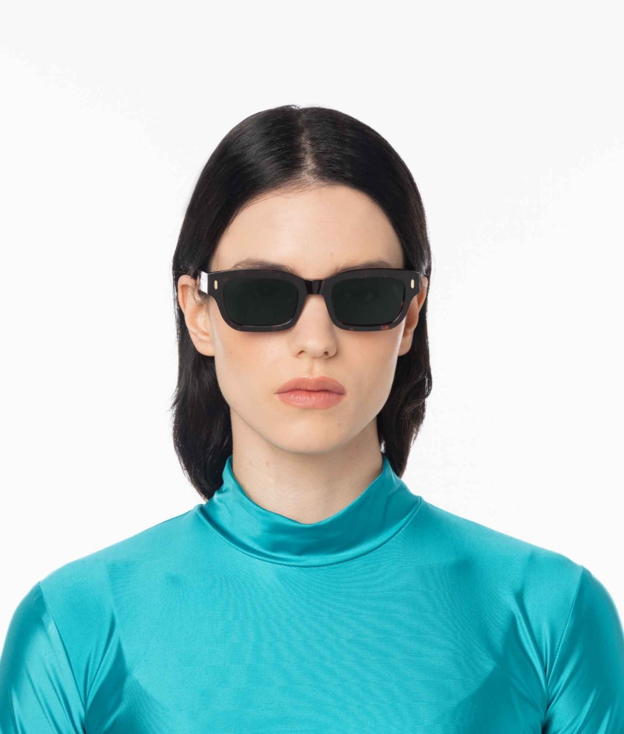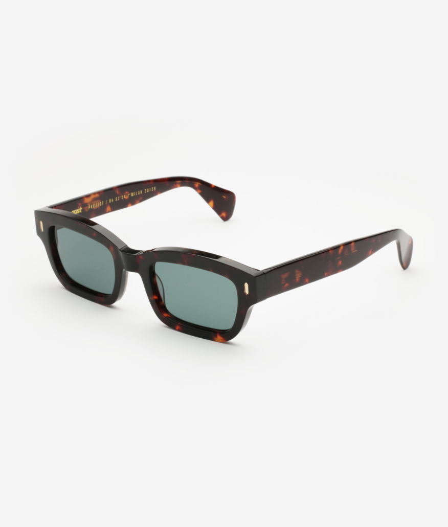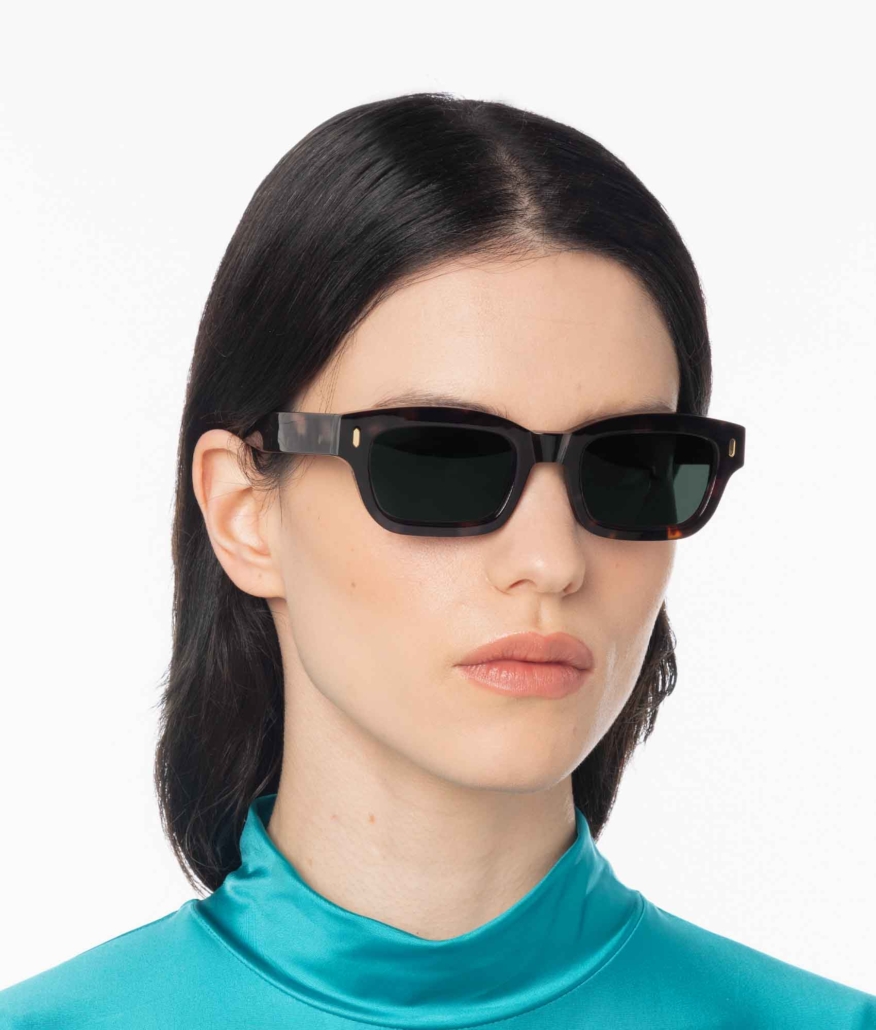 Occhiali da sole realizzati a mano con montatura classica in acetato havana e lenti in nylon semipiatte verdi con rivestimento interno antiriflesso – protezione 100% UVA/UVB. Cerniere in metallo a cinque cilindri. Custodia rigida di alta qualità e panno per la pulizia in microfibra.