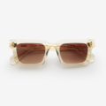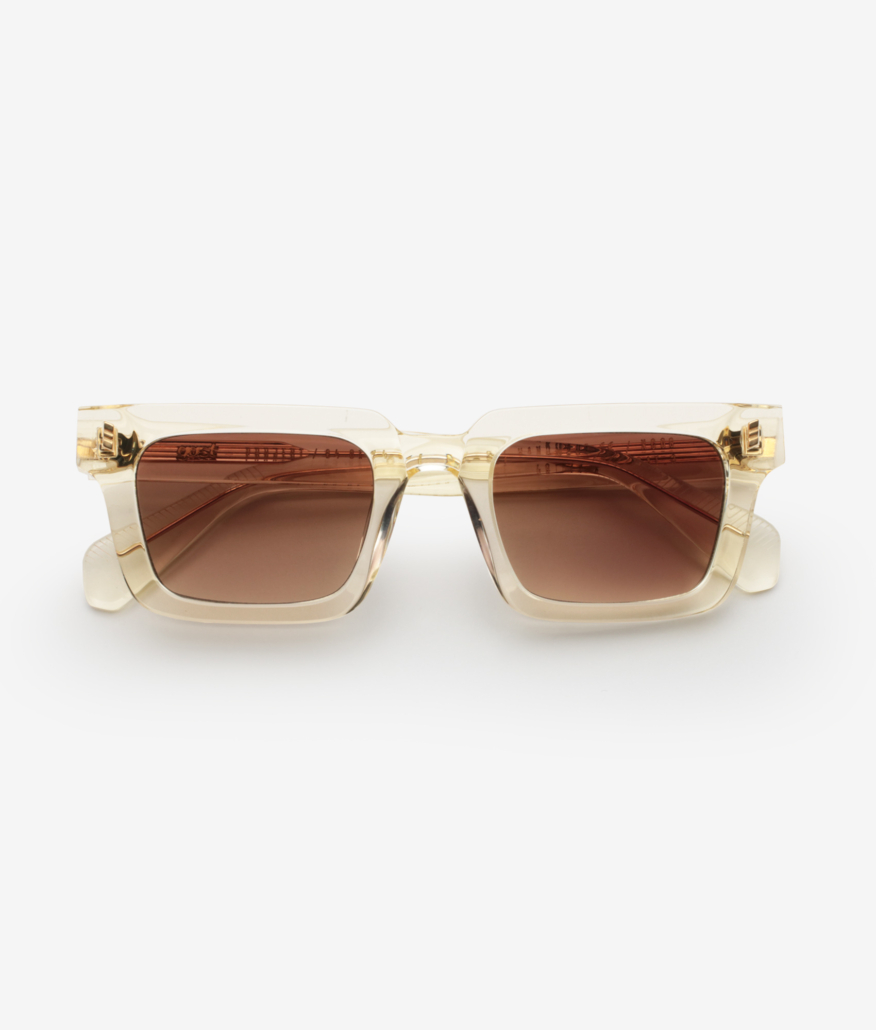 Occhiali da sole fatti a mano con montatura in acetato champagne e anima in filo personalizzato oro. Lenti in nylon marrone sfumato – protezione 100% UVA / UVB con rivestimento interno antiriflesso.